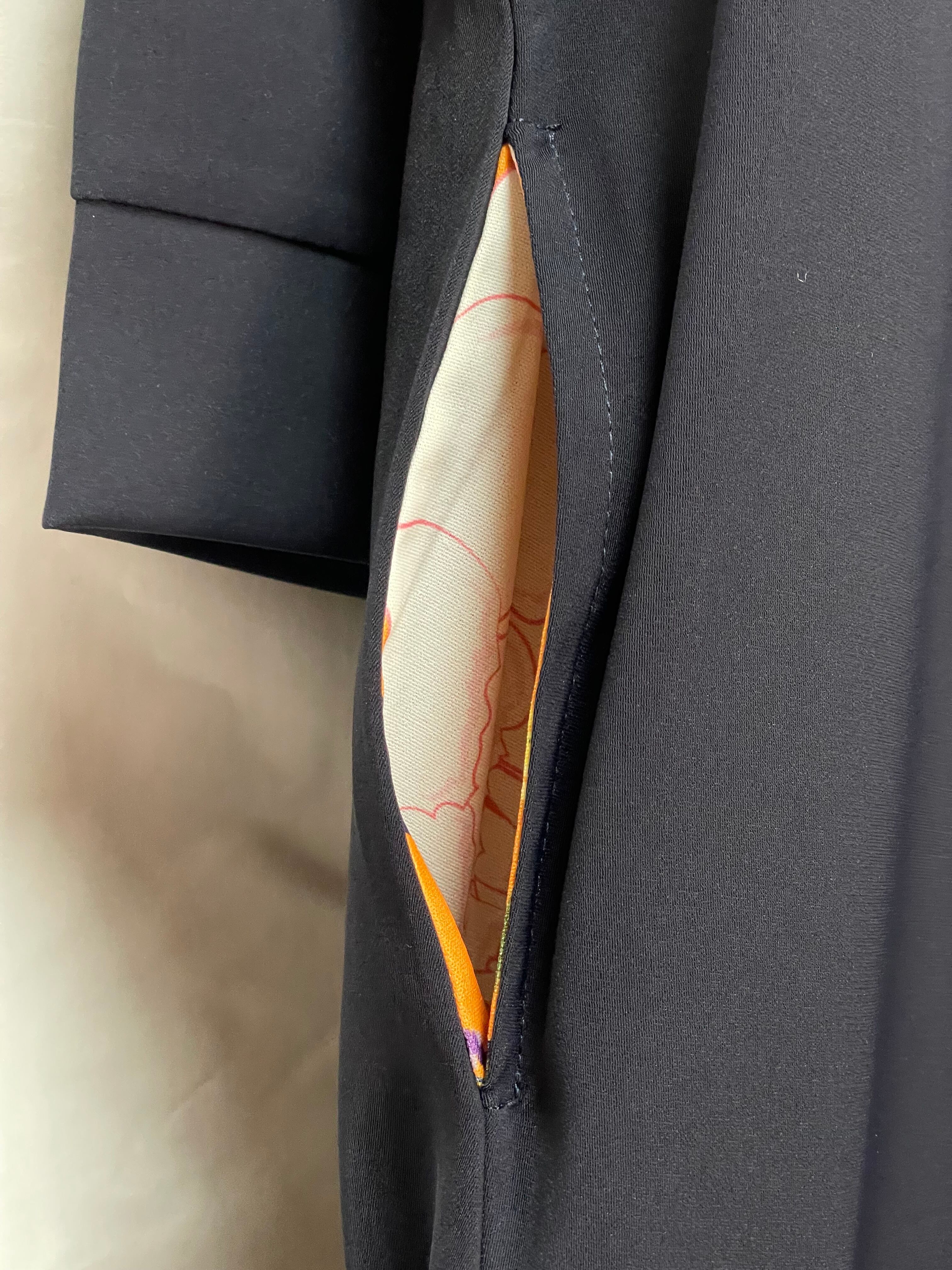 後ろ身やポケットの柄がちらりと見えて、隠れたお洒落を演出します。一華、芍薬、牡丹のモチーフが、華やかな印象。