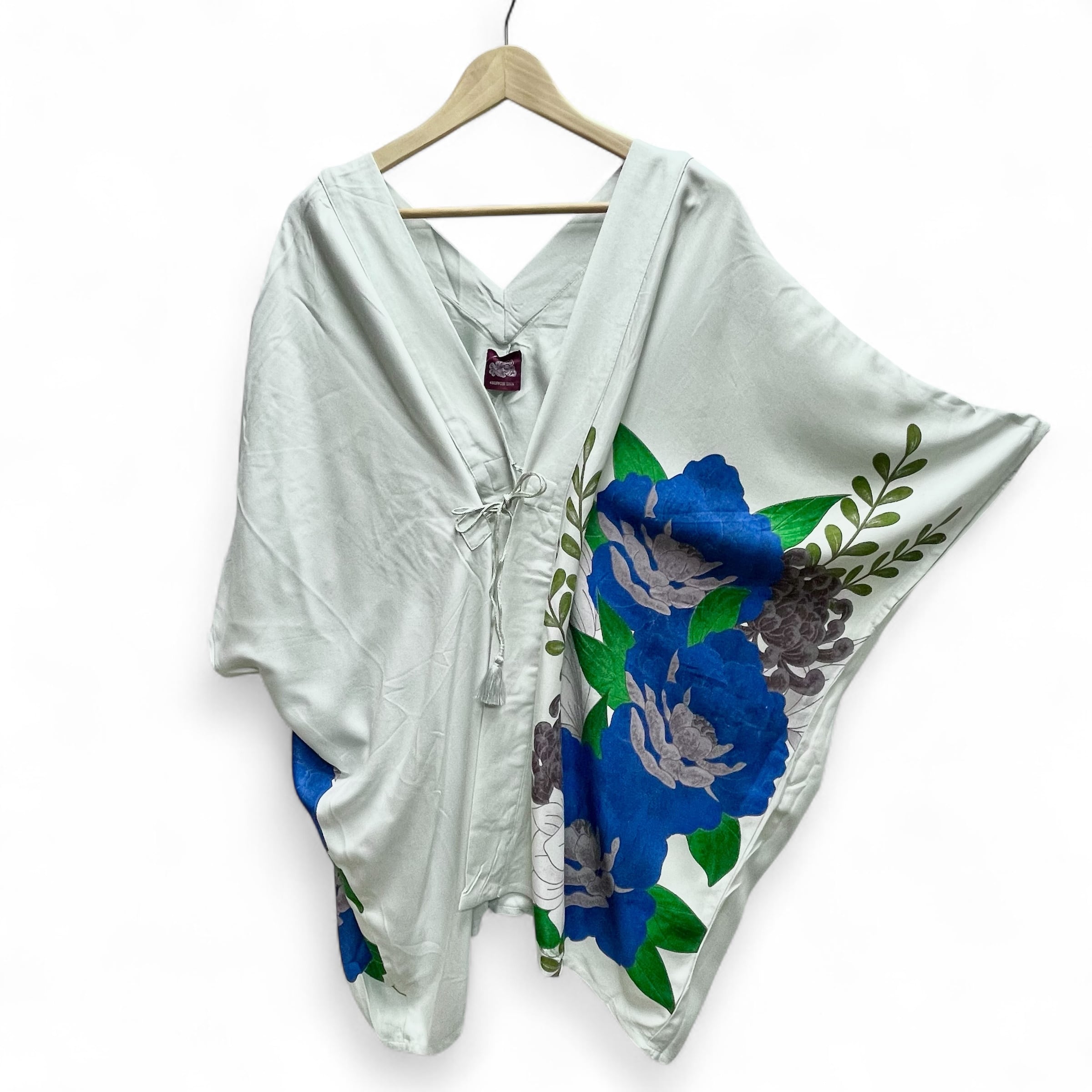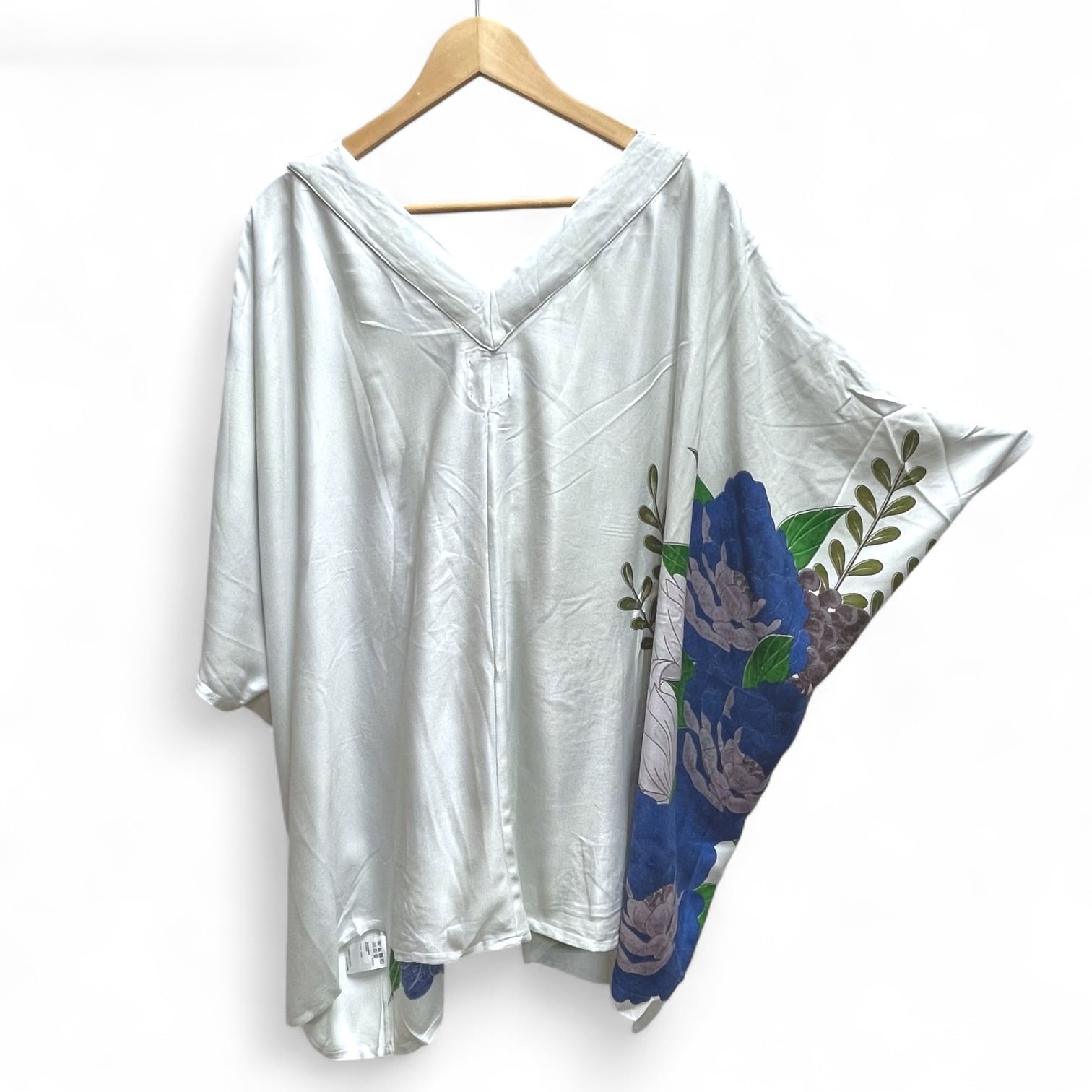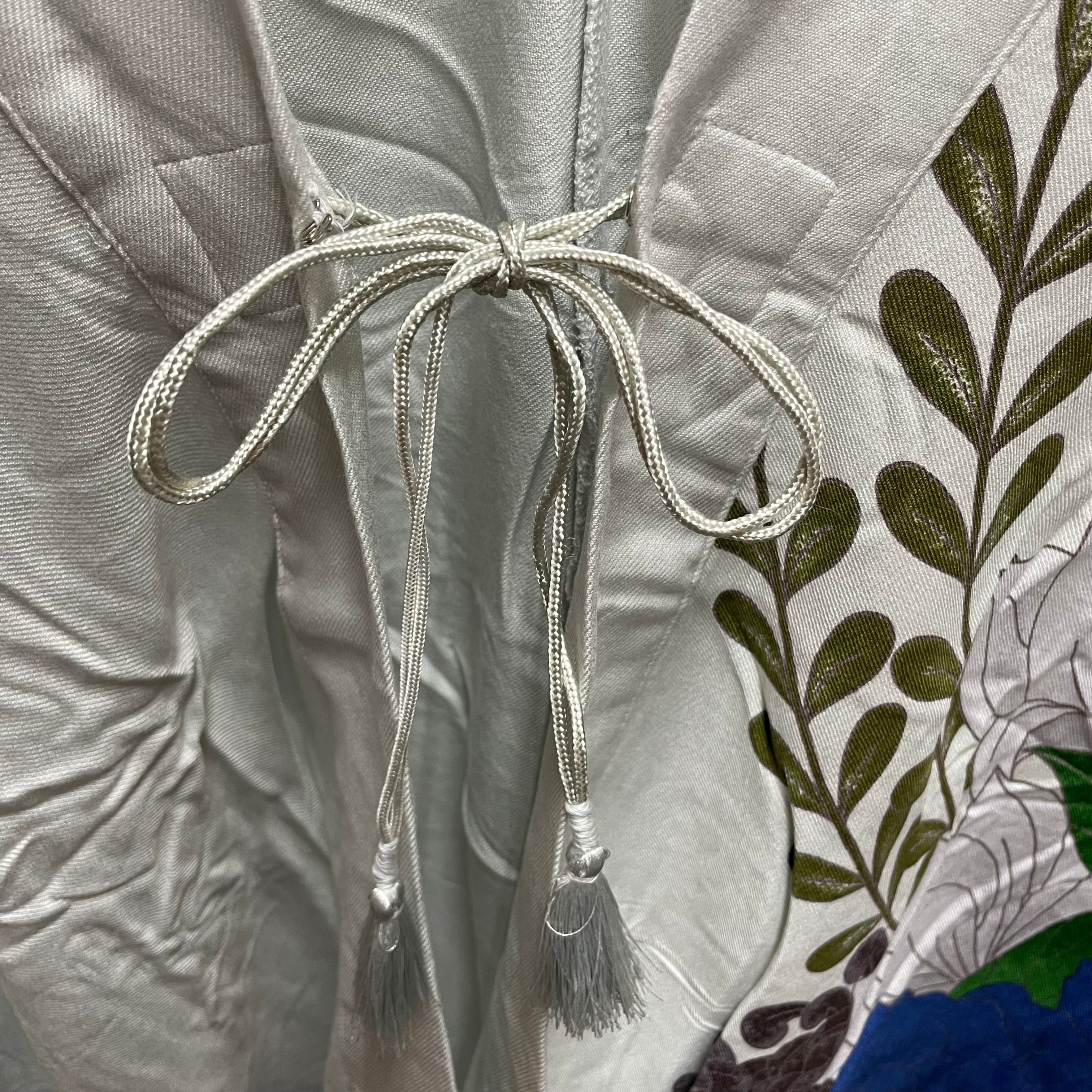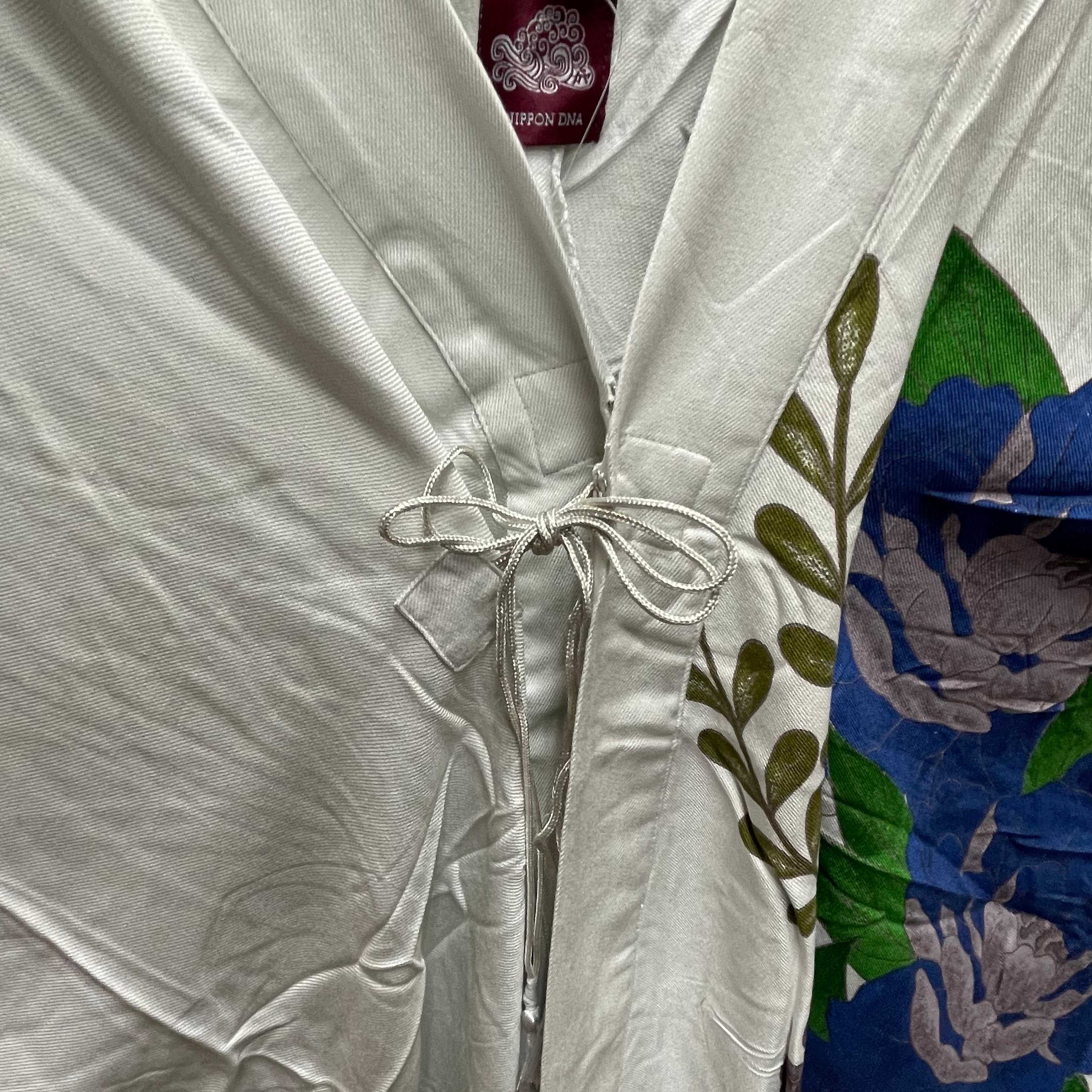 菊や牡丹などの様々な種類の花を大胆にあしらった短丈の羽織。