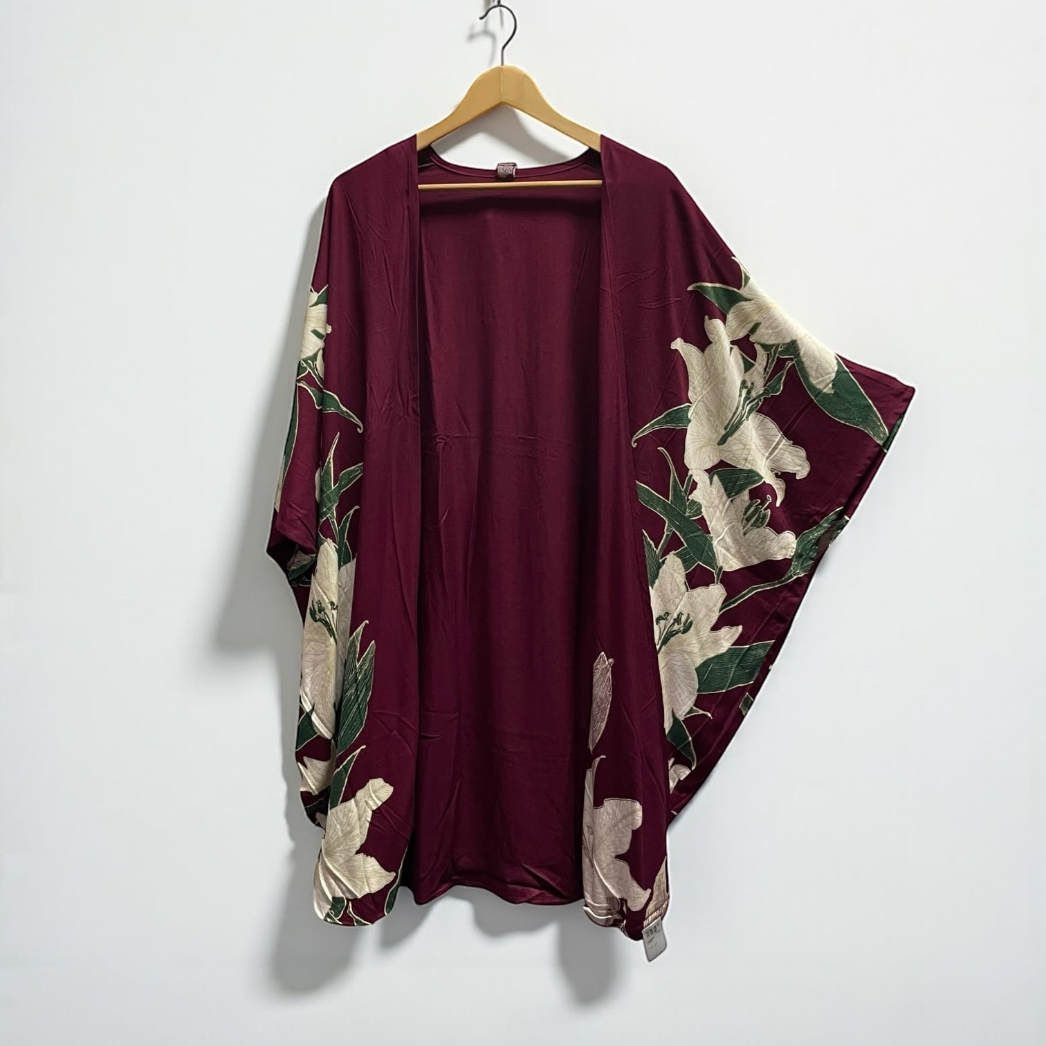 人気シリーズの振袖風羽織に新しく、百合が連なったデザインが登場! ゆったりとした形で、体型を気にせず着用できます。着丈もたっぷりあり、お尻まで隠れるシルエットです。 洋服だけでなく着物に合わせても着れます。 【サイズ】 着丈 98cm 身幅 125cm 裄丈 62.5cm 【素材・成分】 レーヨン100% 【生産地】 インド